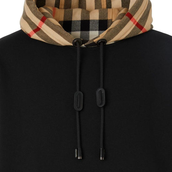 Black archive beige cotton ribbed trim vintage check pattern drawstring hood long sleeves front pouch pocket check motif cotton hoodie