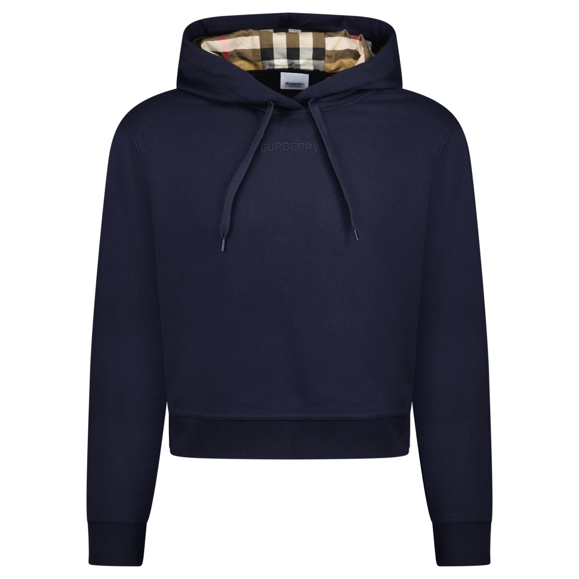 elevate your casual wardrobe with the burberry 'talley' embroidery logo check hooded sweatshirt in navy. this stylish hoodie features a short-length design, combining contemporary style with classic burberry detailing. the hood is lined with the iconic burberry check pattern, while the embroidered logo on the front adds a refined touch. complete with adjustable pullstrings and a soft construction, this hoodie is perfect for layering or wearing on its own for a standout casual look.