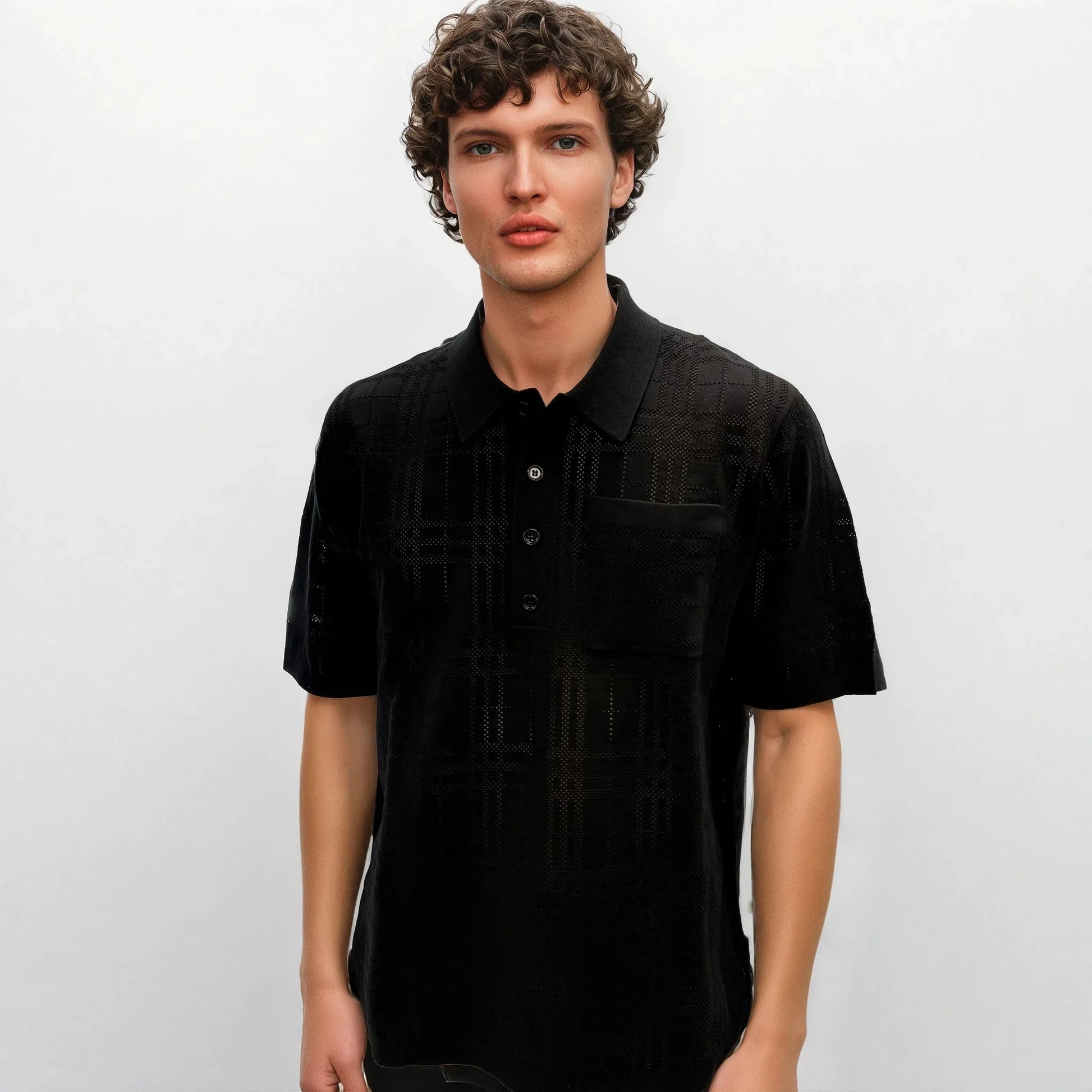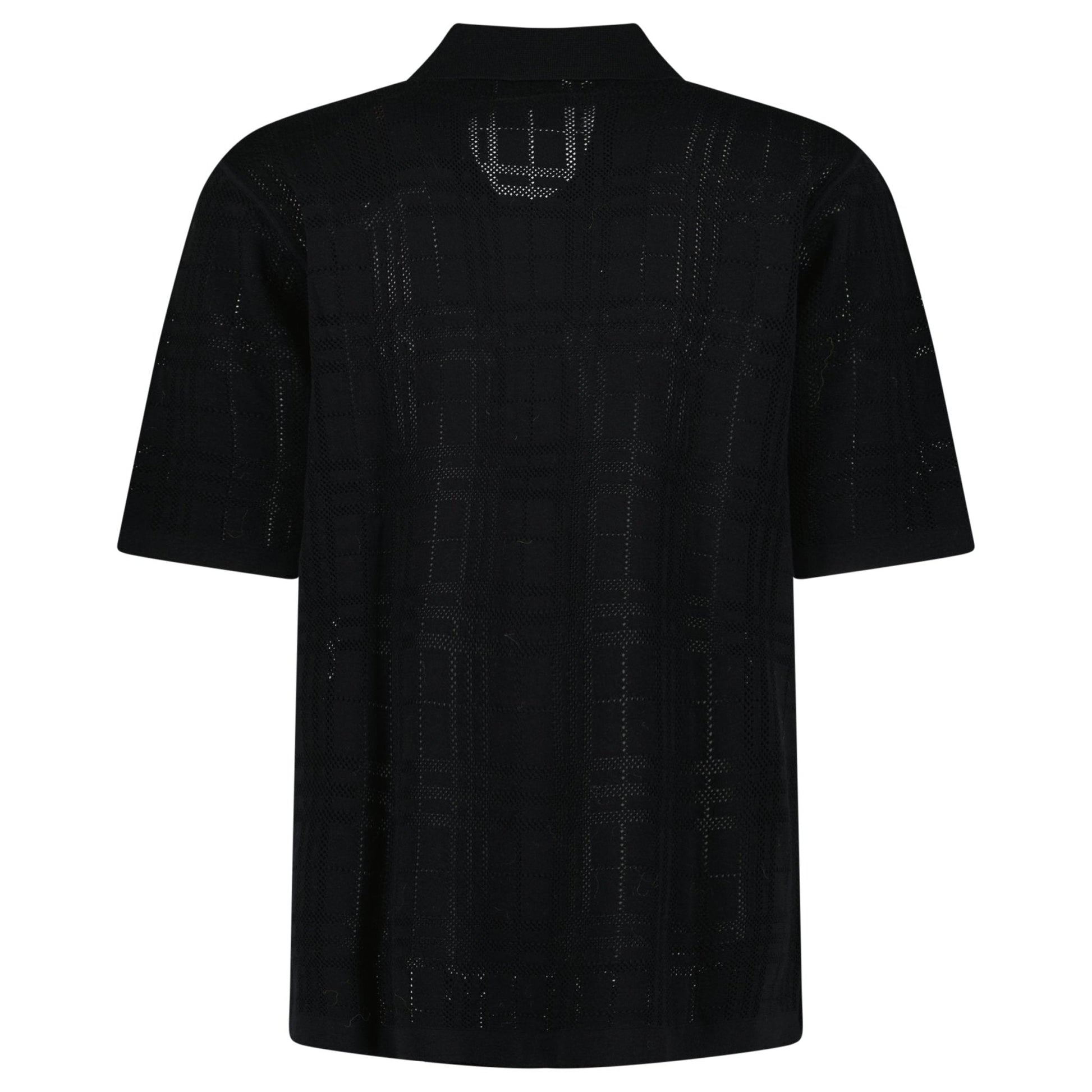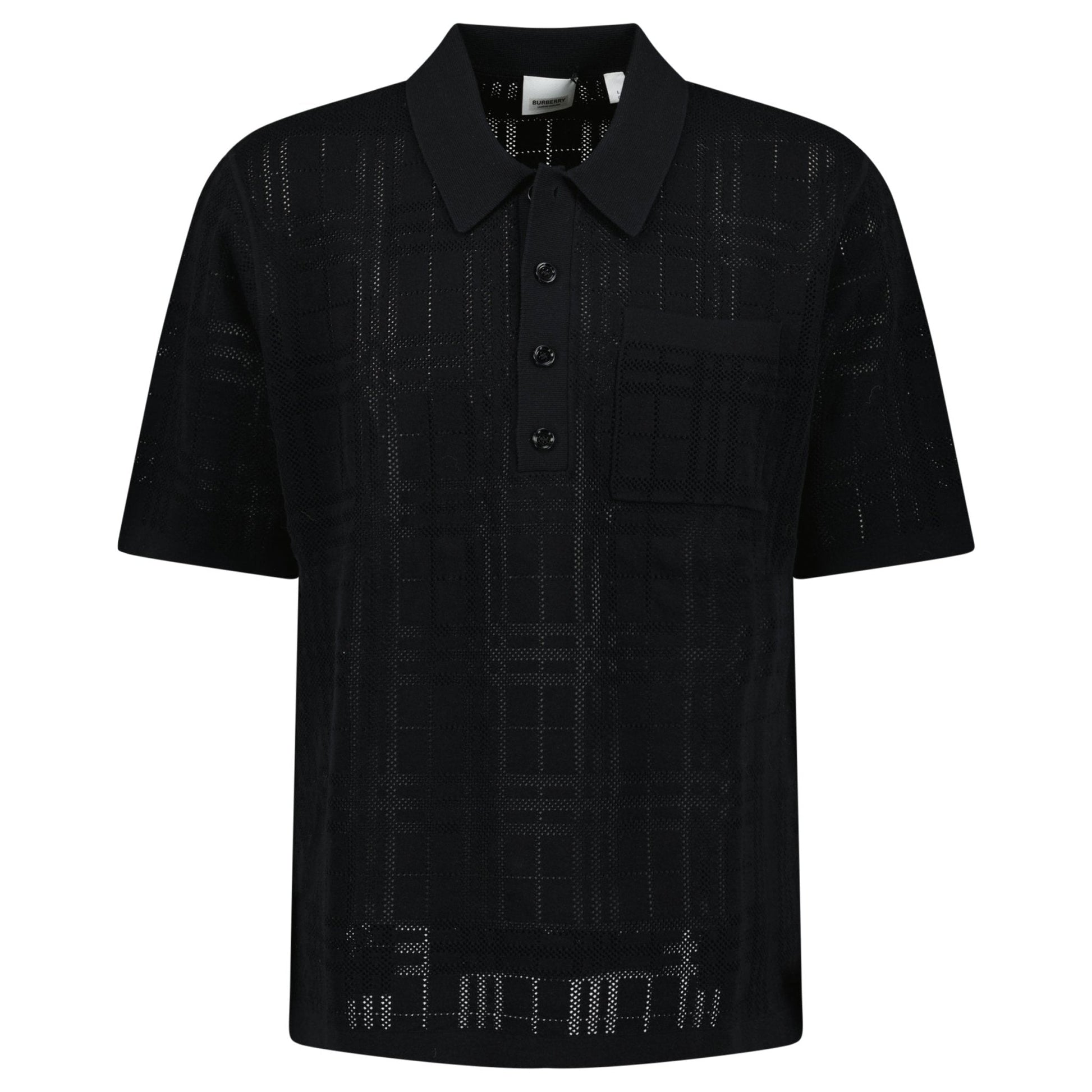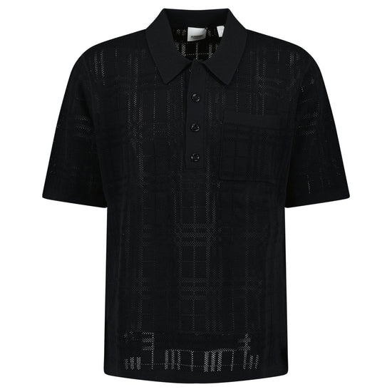 elevate your knitwear rotation with the burberry tristam check knitted polo in black. combining modern comfort with heritage design, this relaxed-fit polo features burberry’s signature check subtly woven into a soft cotton and polyamide blend. with a four-button placket and front chest pocket, this piece offers a casual yet polished aesthetic — perfect for versatile, everyday styling.