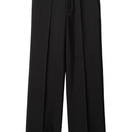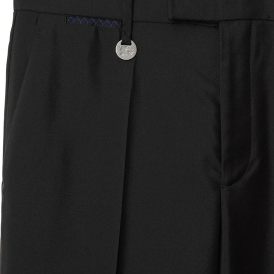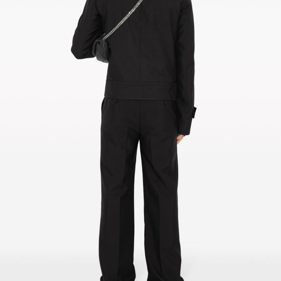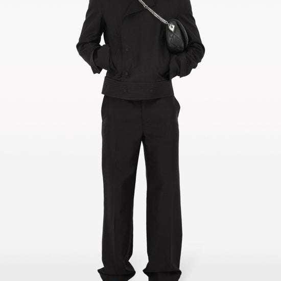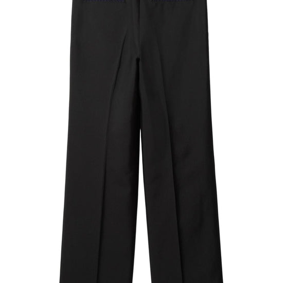 Black wool-silk blend logo charm mid-rise belt loops concealed front fastening side pouch pockets two rear welt pockets pressed crease straight leg wool and silk blend trousers size and fit - this piece fits true to size. we recommend you get your regular size. model is 1,84m / 6ft 1in wearing size 48 (it)