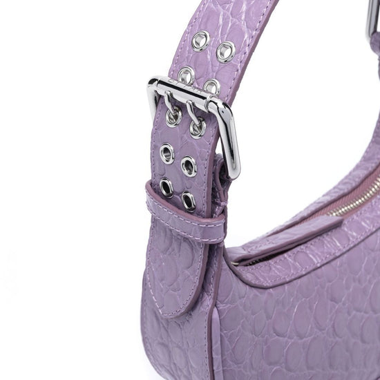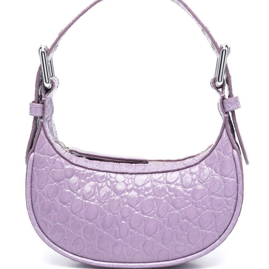 Mini soho crocodile-embossed shoulder bag from by far featuring violet purple, calf leather, cotton, embossed crocodile effect, silver-tone hardware, adjustable shoulder strap, top zip fastening and full lining. mini soho croco embossed leather shoulder bag size and fit - width 7,48 in / 19 cm