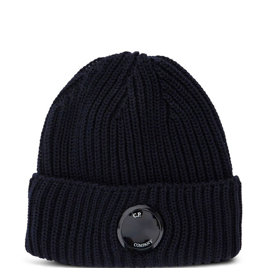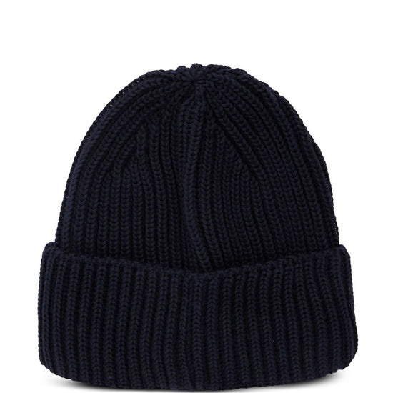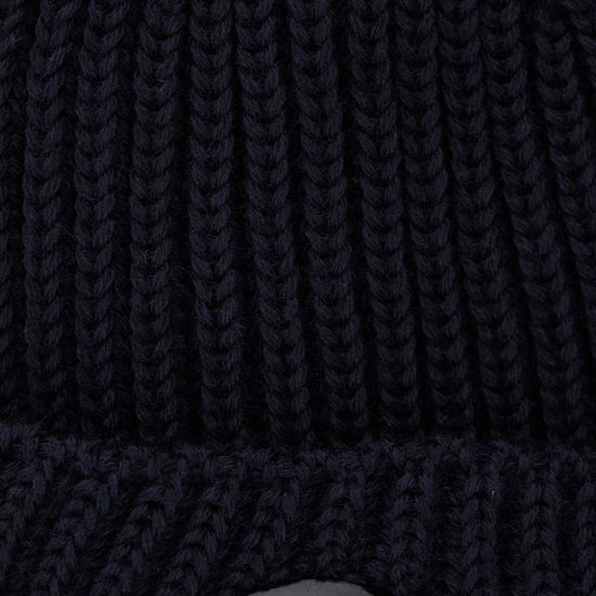 Blue ribbed knit goggle lens detail folded brim close-fitting logo wool beanie