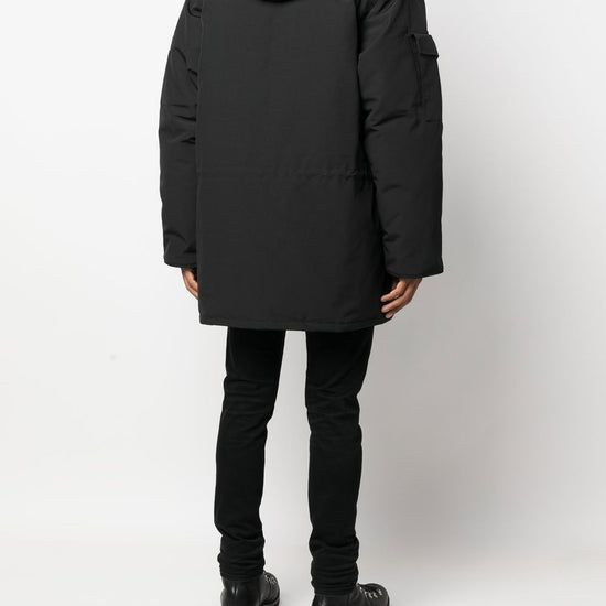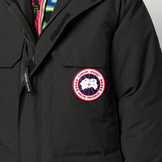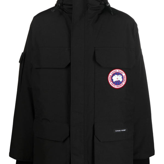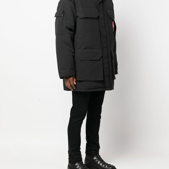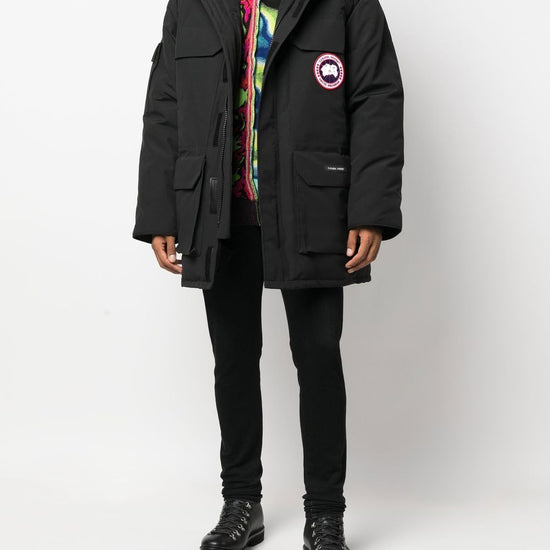 Black feather down logo patch to the front four front flap pockets classic hood front zip fastening sleeve flap pocket long sleeves straight hem expedition parka size and fit - chest: 138.0 centimetres. sleeve length: 74.0 centimetres.