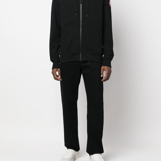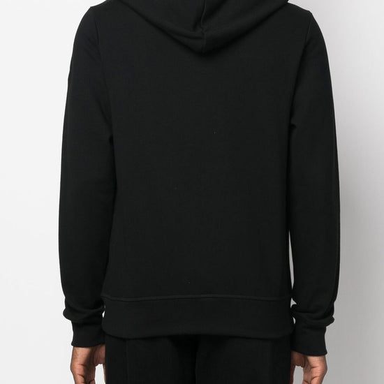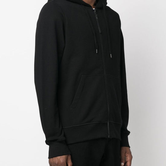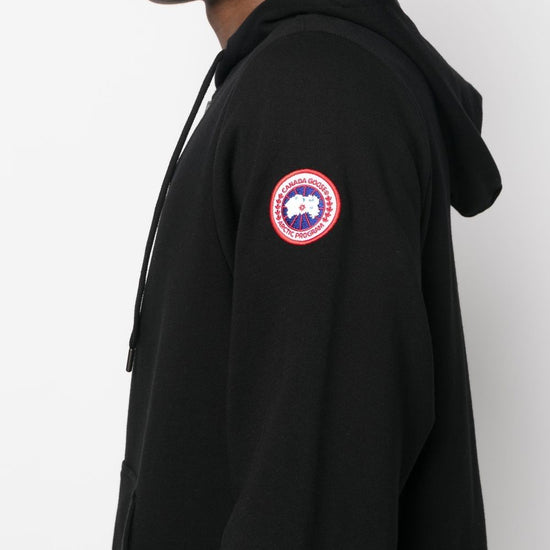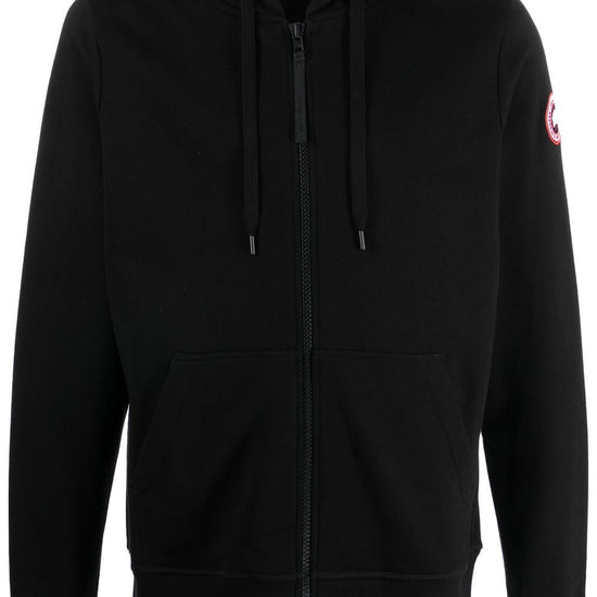 Black cotton logo patch at the sleeve drawstring hood front zip fastening long sleeves cuff sleeves elasticated cuffs elasticated hem straight hem huron cotton hoodie size and fit - chest: 118.0 centimetres. sleeve length: 68.0 centimetres.