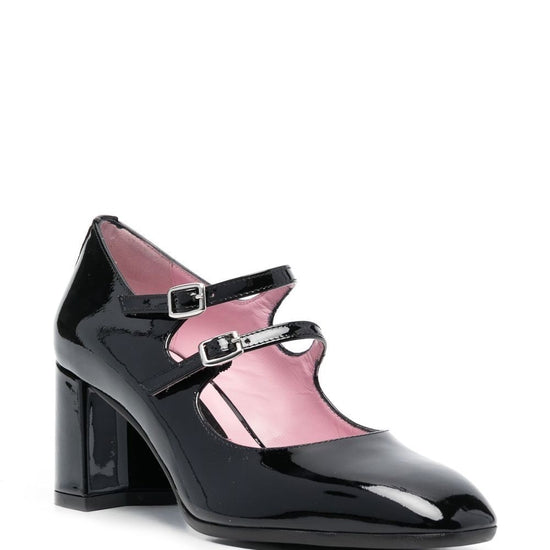 Black calf leather patent finish double-strap design buckle fastening mid block heel alice patent leather pumps size and fit - the model has a narrow fit; we recommend purchasing one size down.