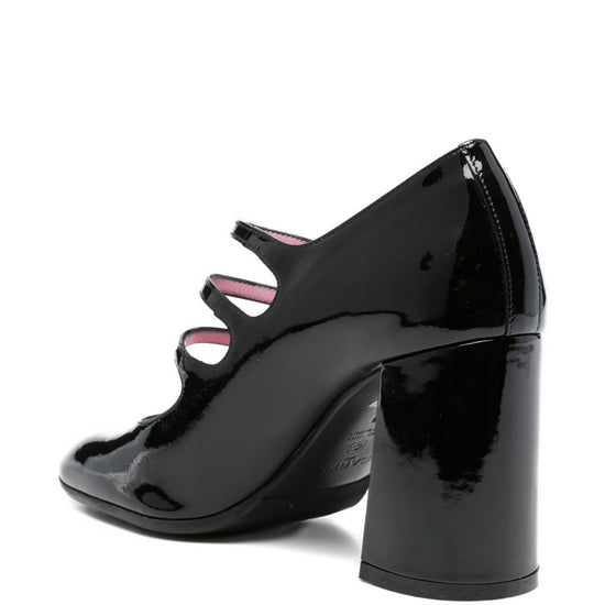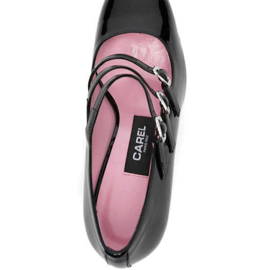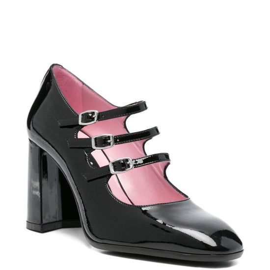 Jet black calf leather patent finish silver-tone hardware almond toe buckle fastening branded leather insole 90mm block heel leather outsole rubber sole keel patent leather pumps size and fit - the model has a narrow fit; we recommend purchasing one size down.