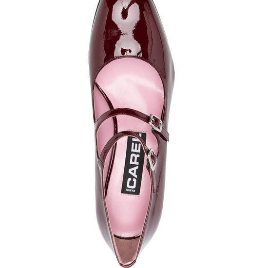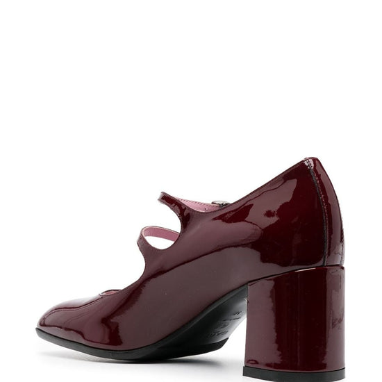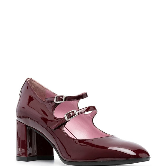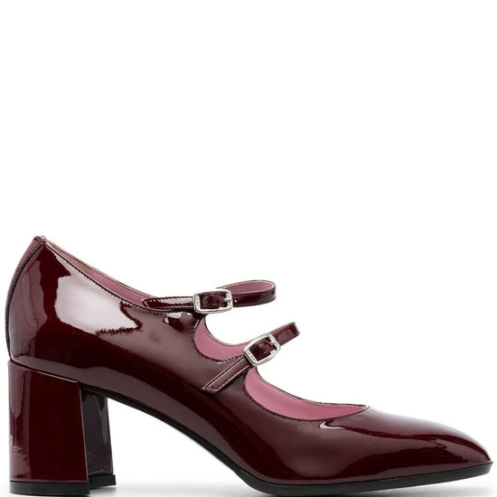 Burgundy calf leather patent finish square toe side buckle fastening branded insole 65mm block heel leather sole alice patent leather pumps size and fit - the model has a narrow fit; we recommend purchasing one size down.