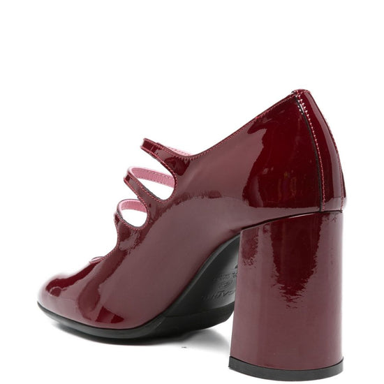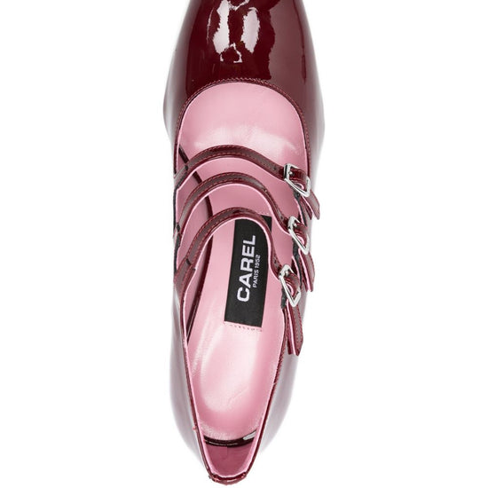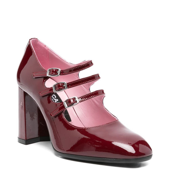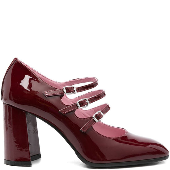 Burgundy patent finish triple buckle fastening block heel almond toe keel patent leather pumps size and fit - the model has a narrow fit; we recommend purchasing one size down.
