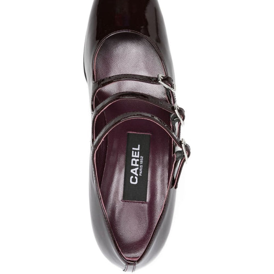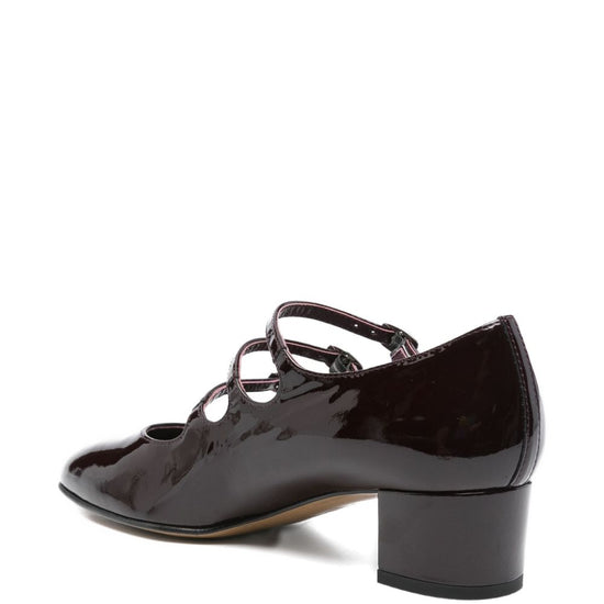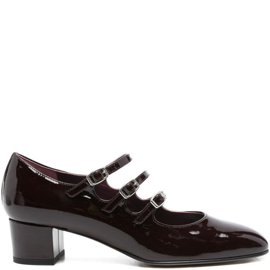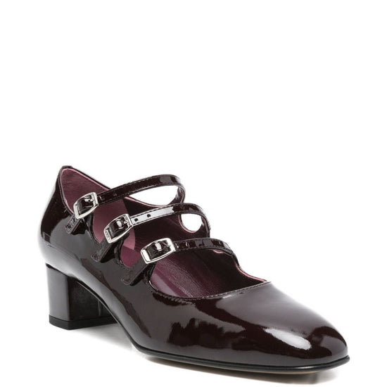 Brown patent finish triple buckle fastening block heel round toe kina leather pumps size and fit - the model has a narrow fit; we recommend purchasing one size down.