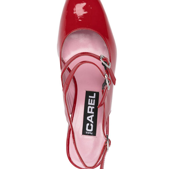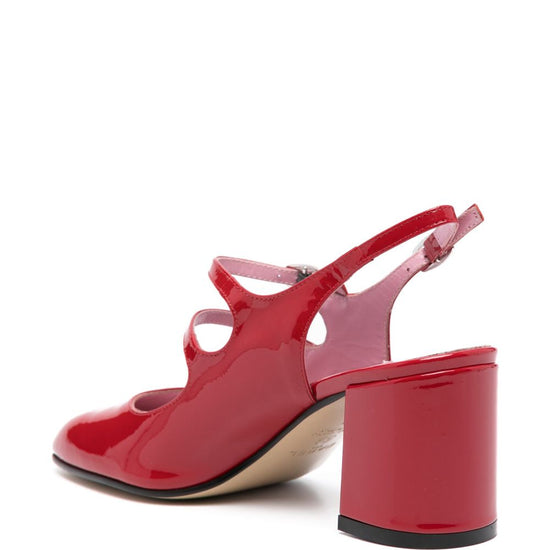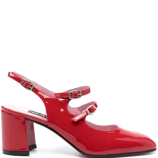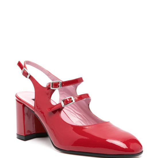 Bright red calf leather patent finish tonal stitching almond toe double-strap design two buckle-strap fastenings branded leather insole 60mm mid block heel leather sole buckle-fastening slingback strap banana patent leathet pumps size and fit - heel: 7.0 centimetres.