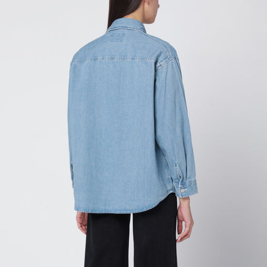 W'' l/s marly shirt by carhartt wip in medium-weight faded blue cotton denim, featuring an oversized fit, classic collar, front button fastening, logo buttons, chest pocket, and square logo label. size and fit - model wears size s model measurements: height: 178 cm chest: 83 cm waist: 63 cm hips: 91 cm