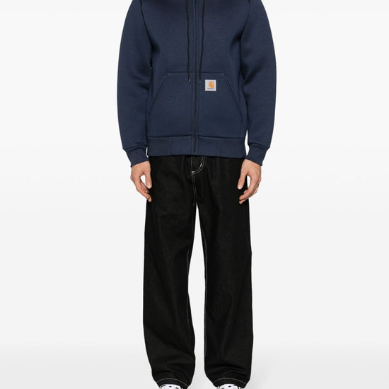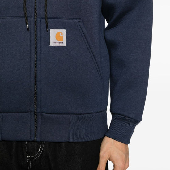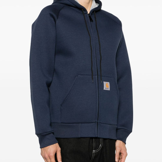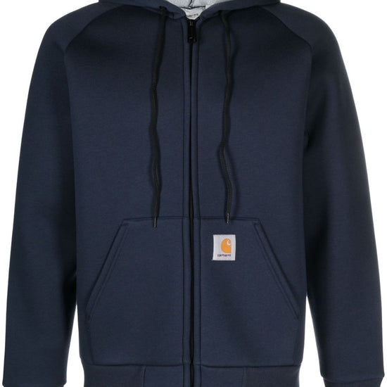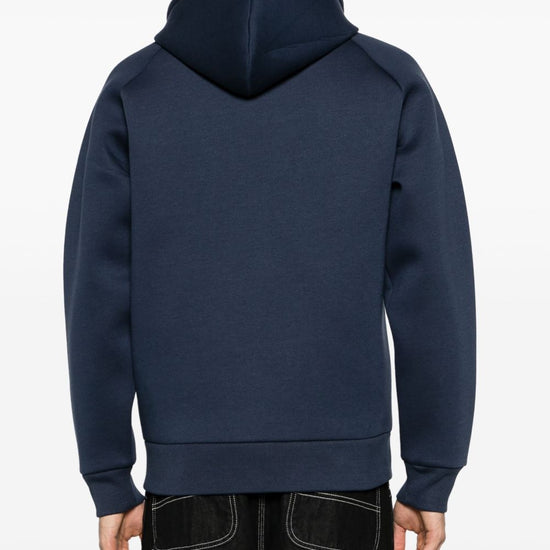 Blue/grey cotton blend sponge jersey texture water-repellent logo patch to the front branded zip puller drawstring hood front zip fastening long sleeves ribbed cuffs and hem two front pouch pockets contrast lining cotton blend hoodie