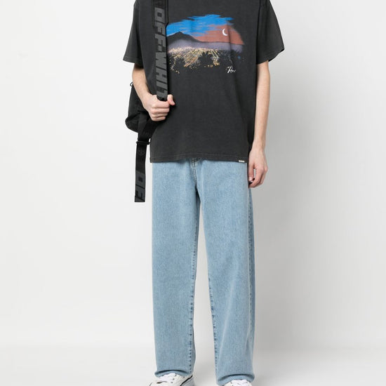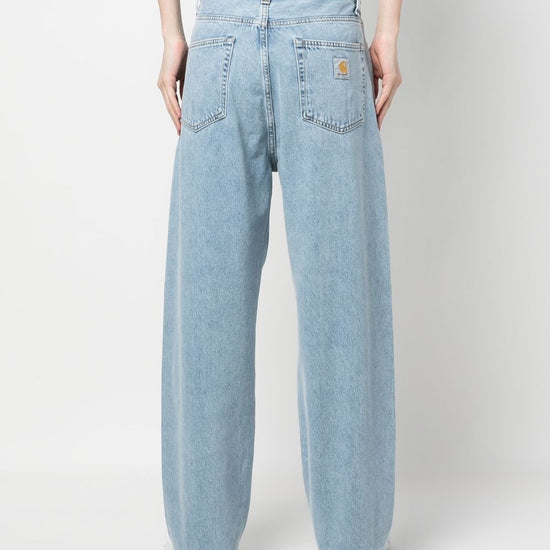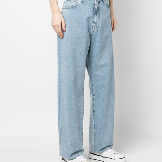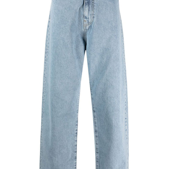Light blue cotton blend denim butterfly fastening classic five pockets belt loops wide leg logo patch to the rear denim cotton jeans size and fit - this piece fits true to size. we recommend you get your regular size. model is 1,84m / 6ft 1in wearing size 32 (waist cm)