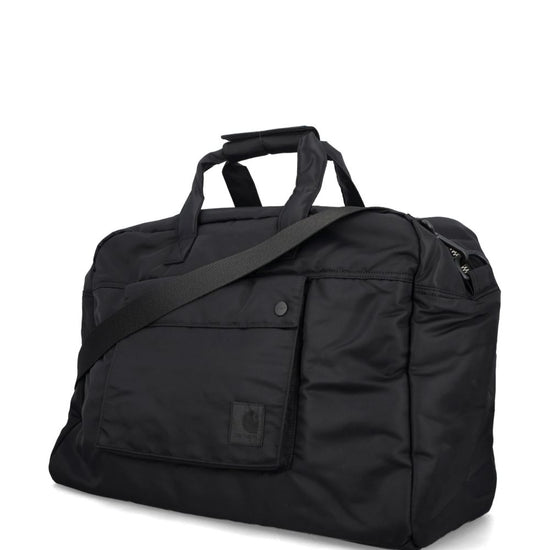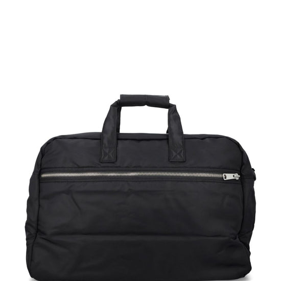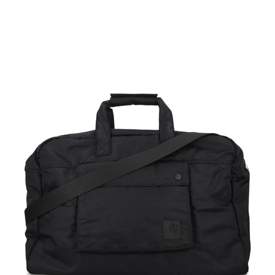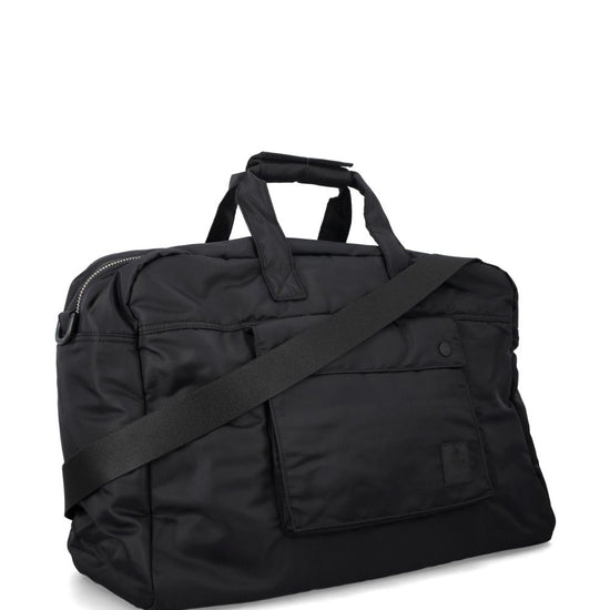 Black appliqué logo two top handles detachable shoulder strap top zip fastening main compartment front flap pocket rear zip fastening nylon weekend bag size and fit - height 35 cm. width 49 cm