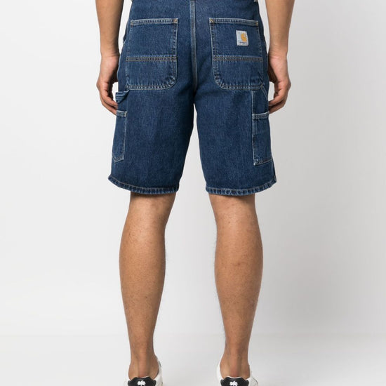 Blue organic cotton denim logo patch to the rear belt loops above-knee length two diagonal pockets to the sides two rear patch pockets two side patch pockets button fly fastening denim cotton shorts