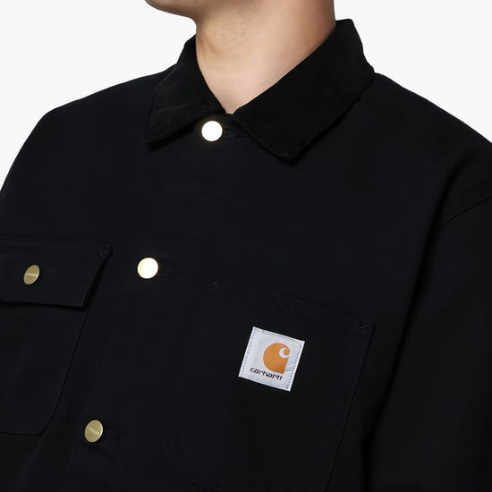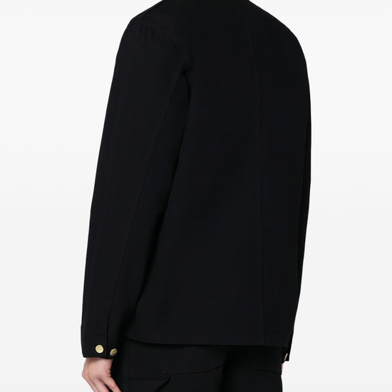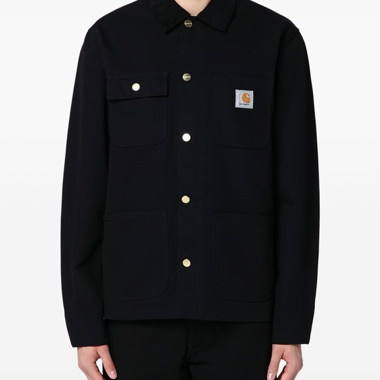 Black organic cotton canvas corduroy collar chest patch pocket logo patch at the chest button-fastening chest pocket long sleeves buttoned cuffs two front patch pockets embossed gold-tone buttons front button fastening michigan canvas jacket