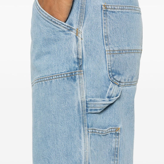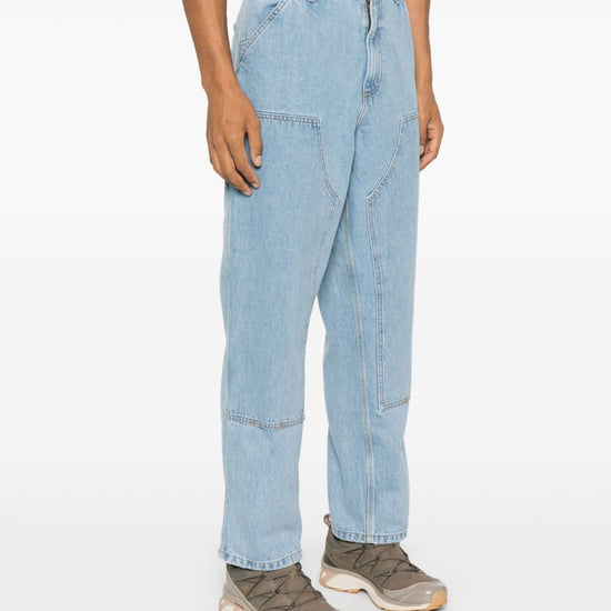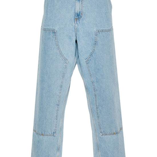 Light blue cotton front button and zip fastening belt loops two diagonal pockets to the sides logo patch to the rear two rear patch pockets double knee denim jeans size and fit - this piece fits true to size. we recommend you get your regular size. model is 1,84m / 6ft 1in wearing size 32 (waist cm)