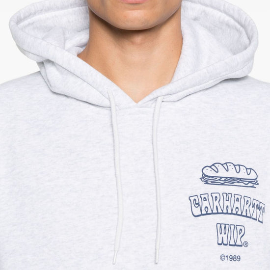 Ash grey, drawstring hoodie, front pouch pocket, long sleeves, ribbed cuffs, graphic print. logo cotton hoodie