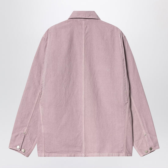 Carhartt wip jacket in medium-weight cotton-linen canvas without lining in pink fog colour, featuring four front pockets, one of which has a flap and button, topstitching, rivets at high-wear points, square fabric logo label, front button closure, long sleeves, and adjustable cuffs and waist. size and fit - model wears size l model measurements: height: 187 cm chest: 102 cm waist: 76 cm hips: 92 cm