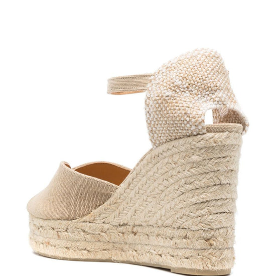 Sand beige calf leather peep toe braided raffia wedge heel buckle-fastening ankle strap branded insole bianca canvas esparilles size and fit - heel 4,3 in / 11 cm; platform 1,6 in / 4 cm