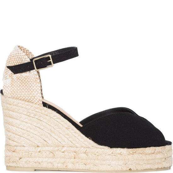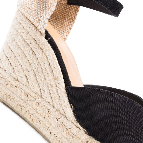 Black plain-weave canvas woven raffia design to the rear peep toe buckle-fastening ankle strap branded leather insole braided raffia high wedge heel rubber outsole bianca canvas esparilles size and fit - heel 4,3 in / 11 cm; platform 1,4 in / 3,5 cm