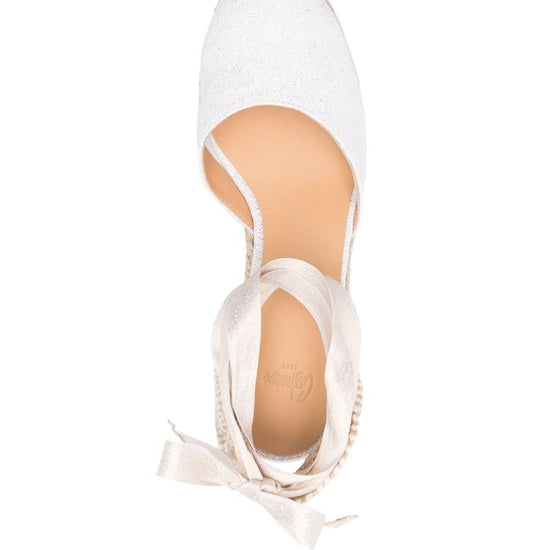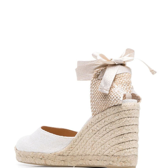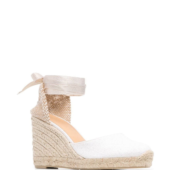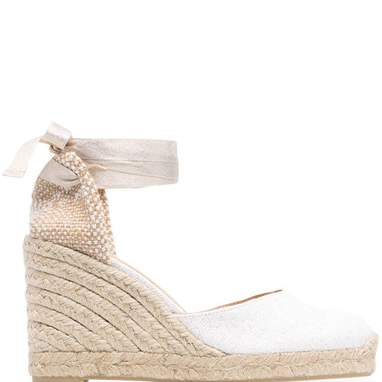 95mm tie-detail platform espadrilles from castañer featuring off-white, almond toe, rear tie fastening and braided raffia platform. carina wedge heel espadrilles size and fit - heel 3,5 in / 9 cm; platform 0,8 in / 2 cm
