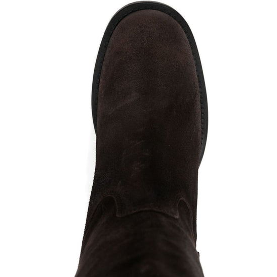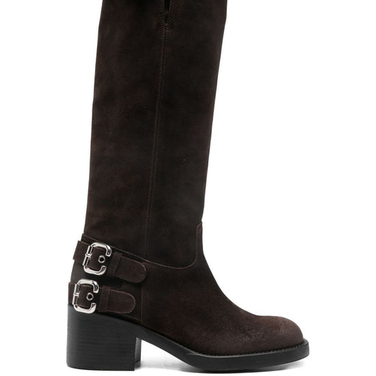 Brown leather upper multiple buckles block heel round toe knee-high shaft dakota leather boots