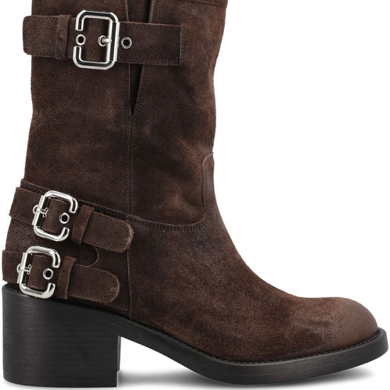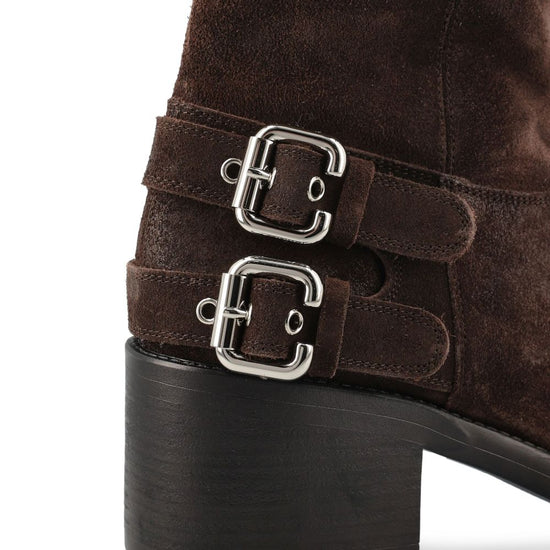 Brown suede buckled straps rounded toe block heel ankle-height dakota leather boots size and fit - heel: 6.0 centimetres.