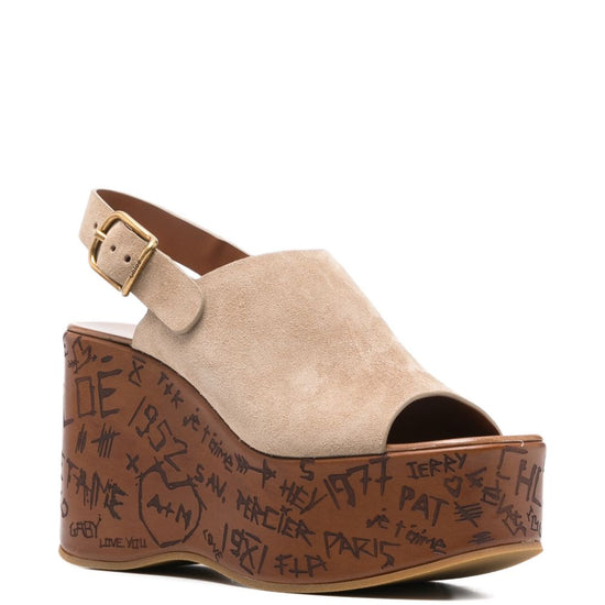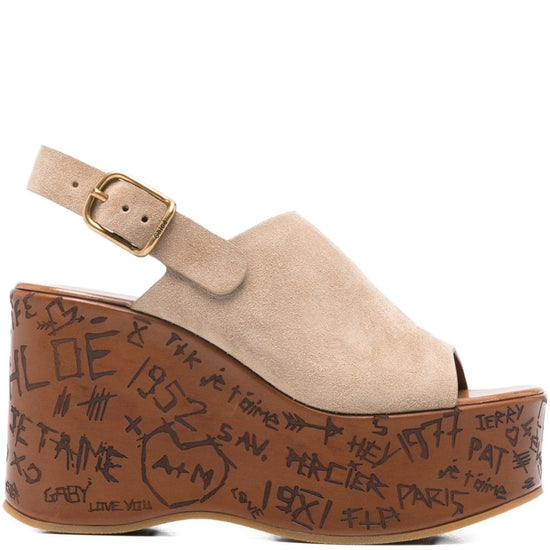 Desert sand platform sole graffiti print peep toe buckle fastening this piece comes complete with a protective dust bag. maxime wedge sandals