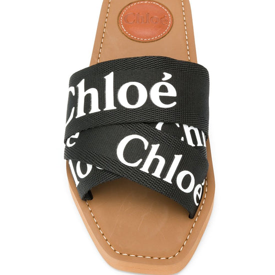 Black open toe slip-on style logo print to the front branded insole flat sole woody flat sandals size and fit - heel 0,8 in / 2 cm; platform 0,6 in / 1,5 cm.