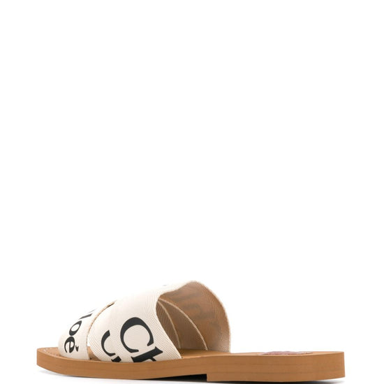 White linen all-over logo print low stacked heel woody flat sandals size and fit - heel 1cm.
