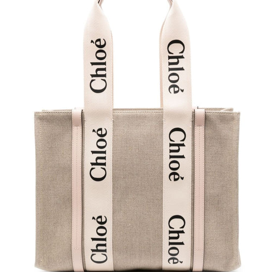 Blush beige linen/flax leather trim signature woody ribbon open top two top handles main compartment internal logo patch internal flap pocket woody canvas medium tote size and fit - width 17,72 in / 45 cm height 13,39 in / 34 cm depth 5,12 in / 13 cm handle 8,27 in / 21 cm.