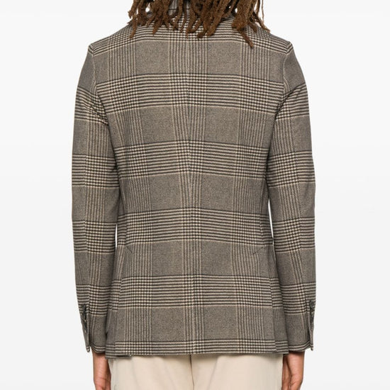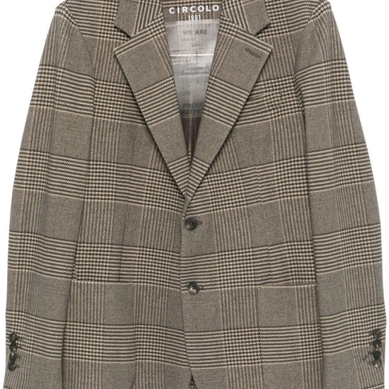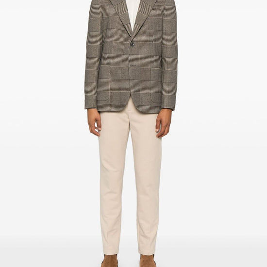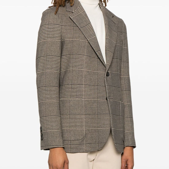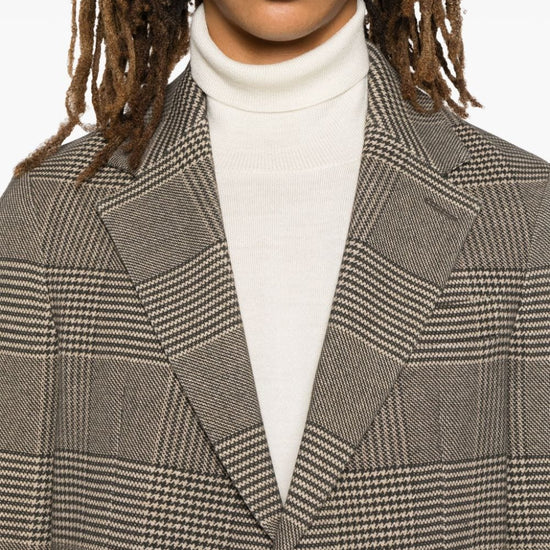 Light brown/black cotton blend fleece texture prince of wales check pattern front button fastening notched lapels long sleeves faux-buttoned cuffs chest welt pocket dart detailing two front patch pockets english rear vents internal jetted pocket partial lining curved hem cotton single-breasted jacket size and fit - this piece fits true to size. we recommend you get your regular size. model is 1,84m / 6ft 1in wearing size 48 (it)