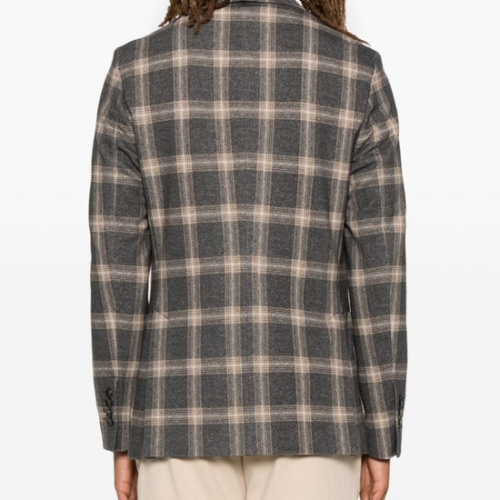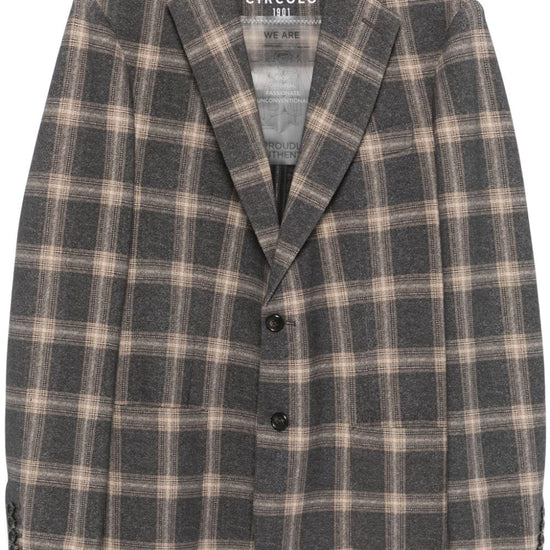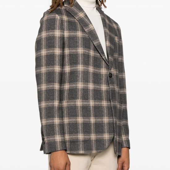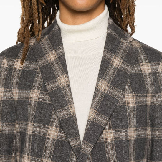 Anthracite grey/barley brown cotton blend fleece texture plaid check pattern front button fastening notched lapels long sleeves faux-buttoned cuffs chest welt pocket dart detailing two front patch pockets english rear vents internal jetted pocket partial lining curved hem cotton single-breasted jacket size and fit - this piece fits true to size. we recommend you get your regular size. model is 1,84m / 6ft 1in wearing size 48 (it)