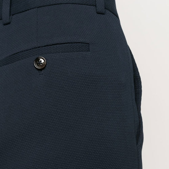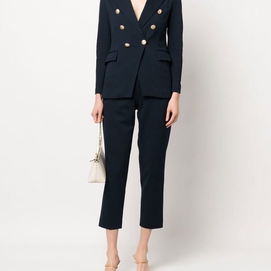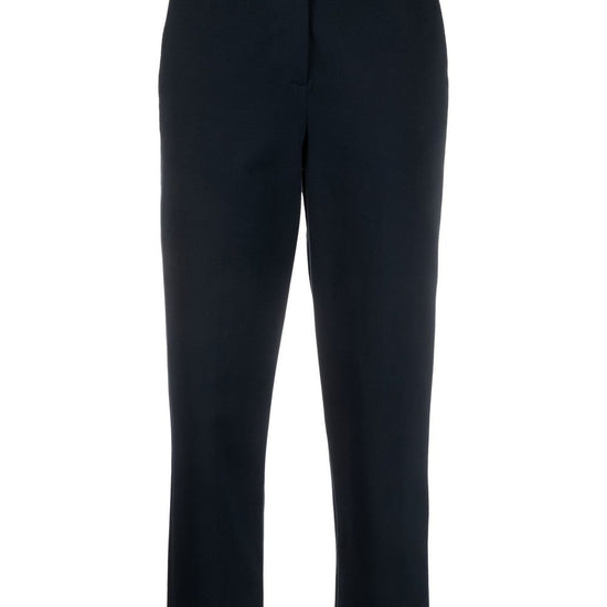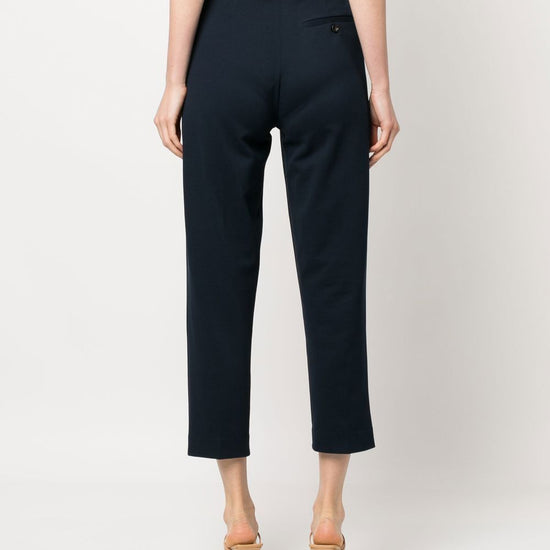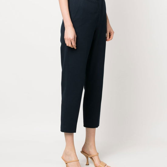 High-waist cropped trousers from circolo 1901 featuring navy blue, stretch-cotton, high waist, tailored cut, cropped leg, belt loops, front button and zip fastening and two rear flap pockets. carrot, c/pieghe cotton cropped trousers size and fit - this piece fits true to size. we recommend you get your regular size. model is 1,75m / 5ft 8in wearing size 40 (it)