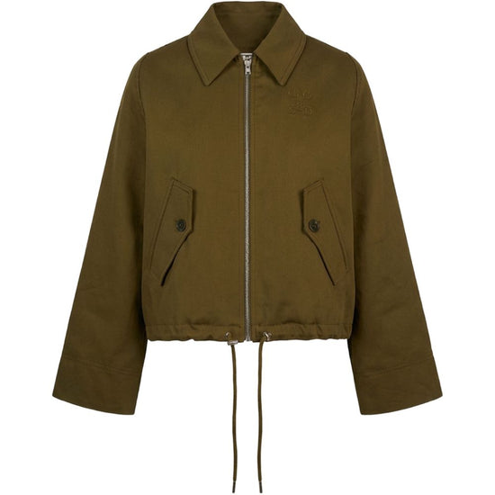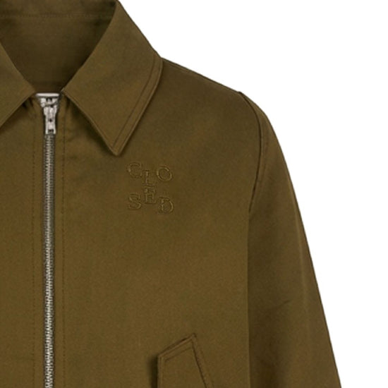 Olive green point collar buttoned flap pockets zip fastening drawstring hem embroidery detail cotton blouson jacket