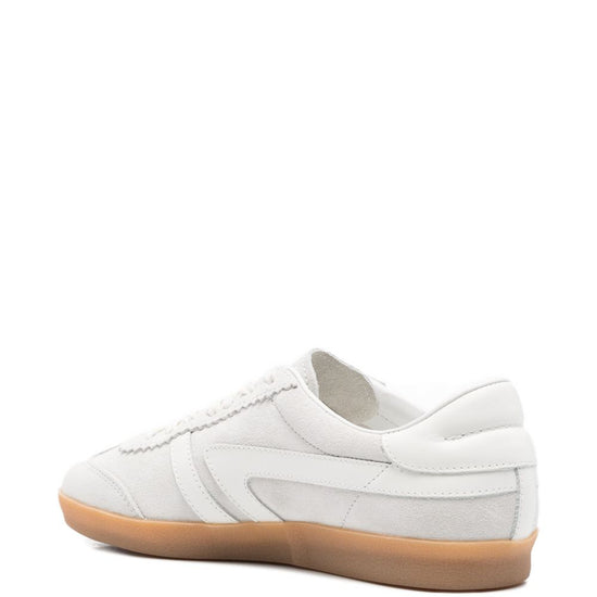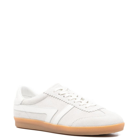 Light grey calf suede scalloped trim gum sole lace-up fastening leather panelling leather sneakers