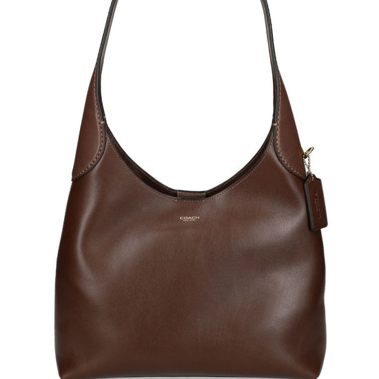 Chocolate brown leather smooth grain logo stamp to the front logo charm single shoulder strap magnetic fastening main compartment internal press-stud fastening pocket gold-tone hardware brooklyn 28 leather shoulder bag size and fit - depth 8 cm. width 27.9 cm. height 27.9 cm. strap 26.6 cm.