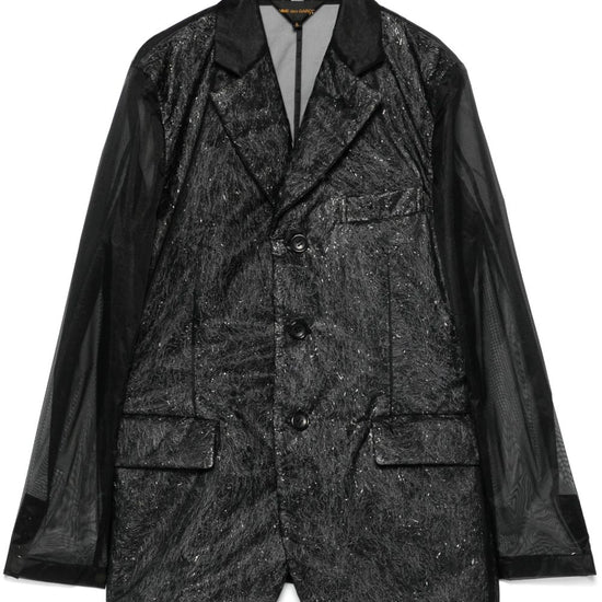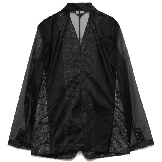 Black front button fastening buttoned cuffs rear slit semi-sheer panels chiffon blazer jacket size and fit - this piece fits true to size. we recommend you get your regular size. model is 1,75m / 5ft 8in wearing size s