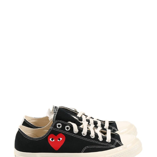Black cotton low top sneaker from comme des garçons play featuring a round toe, a white lace up front, a contrasting white toe cap, a red heart printed logo to the side and a thick white rubber sole. chuck taylor red heart sneakers size and fit - heel 1,2 in / 3 cm; platform 1 in / 2,5 cm.
