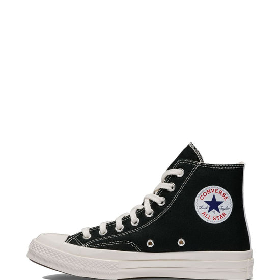 Black/red/white canvas contrasting heel counter heart motif contrast stitching front lace-up fastening rubber toecap round toe flat rubber sole. chuck 70 sneakers size and fit - heel 1,2 in / 3 cm; platform 1 in / 2,5 cm