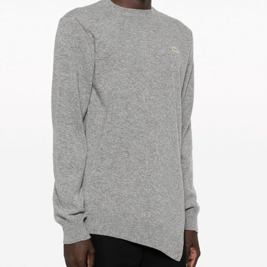 X lacoste asymmetric hem wool jumper from comme des garçons shirt featuring light grey, wool, knitted construction, logo patch at the chest, round neck, asymmetric hem and ribbed cuffs and hem. wool sweater size and fit - this piece fits true to size. we recommend you get your regular size. model is 1,84m / 6ft 1in wearing size m