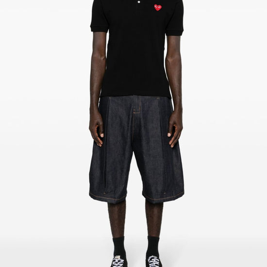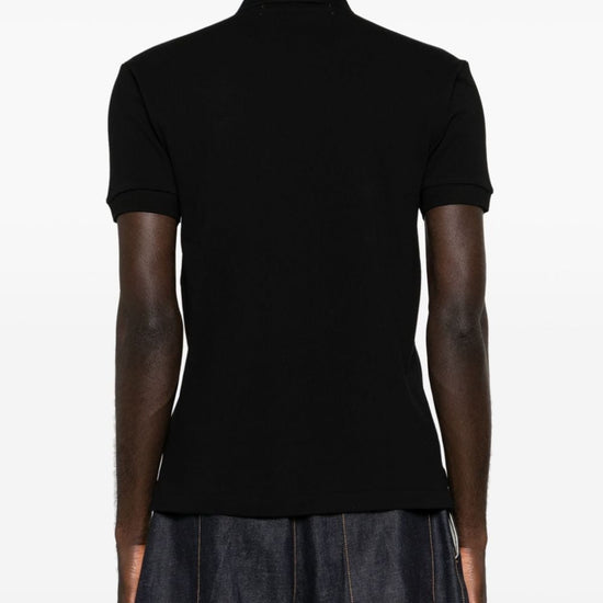 Black cotton piqué weave signature heart patch ribbed trim polo collar front button placket short sleeves short side slits high-low hem. red heart cotton plo shirt size and fit - this piece fits true to size. we recommend you get your regular size. model is 1,84m / 6ft 1in wearing size m