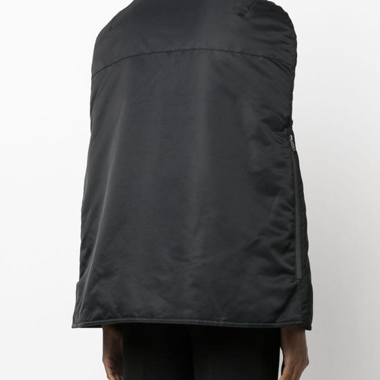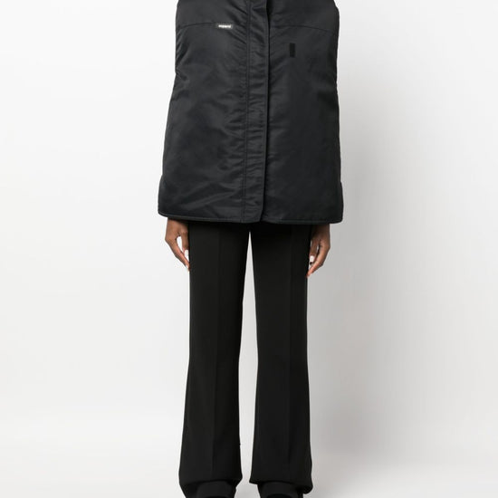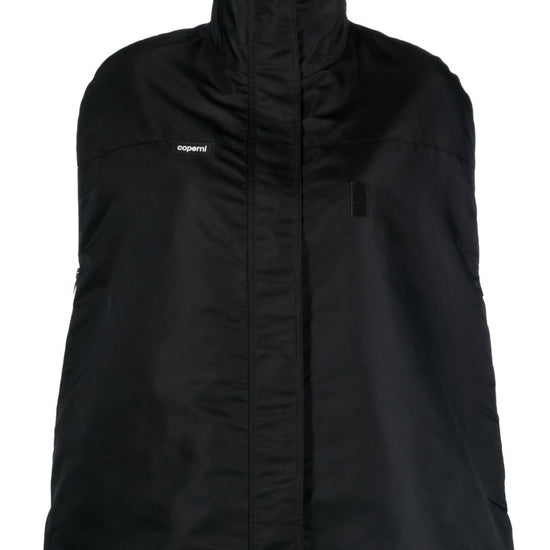 Logo-patch bomber cape from coperni featuring black, cape design, logo patch at the chest, funnel neck, concealed front fastening, two side zip-fastening pockets and straight hem. logo bomber cape size and fit - this piece fits true to size. we recommend you get your regular size. model is 1,75m / 5ft 8in wearing size 36 (fr)