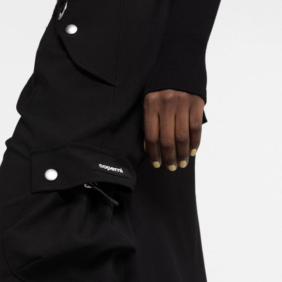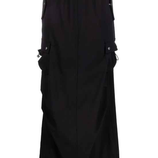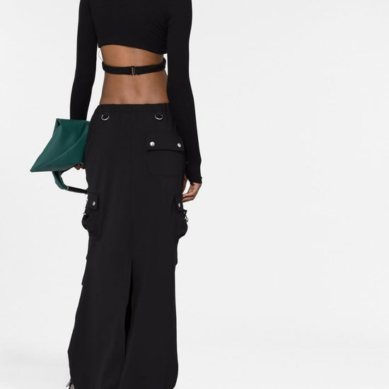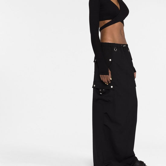 Black low-rise drawstring waist d-ring findings rear slit side cargo pocket two press-stud fastening side pockets rear flap pocket floor-length tailored cargo maxi skirt size and fit - this piece fits true to size. we recommend you get your regular size. model is 1,75m / 5ft 8in wearing size 36 (fr)