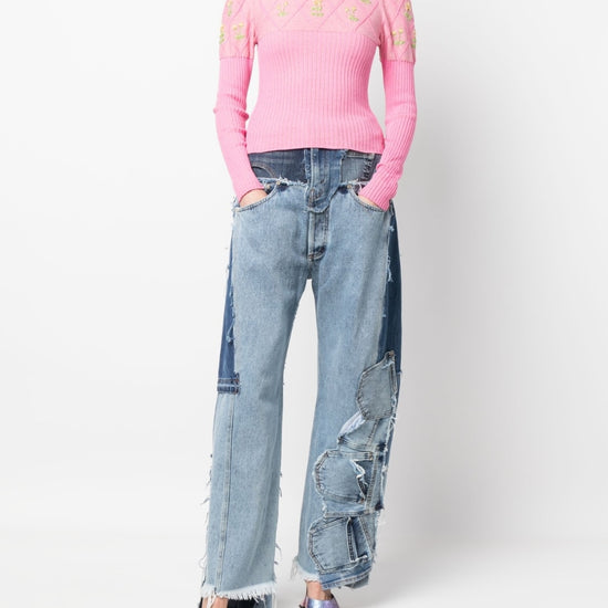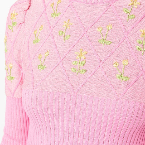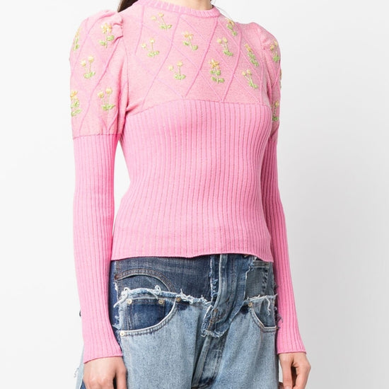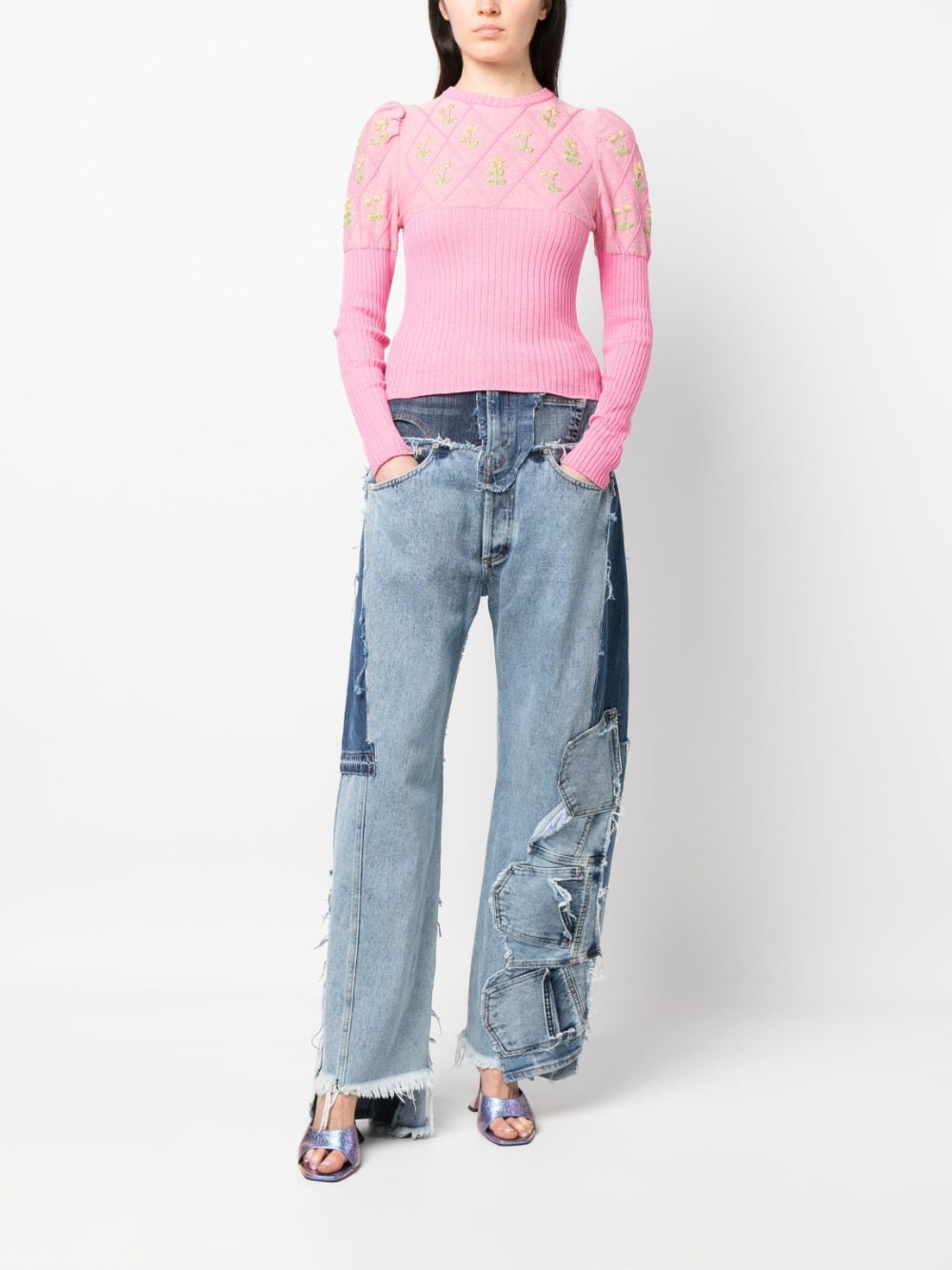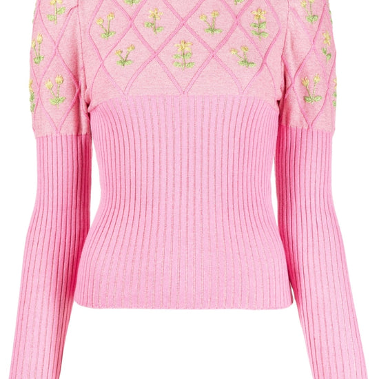 Long-sleeve knitted top from cormio featuring flamingo pink, cotton blend, knitted construction, stretch-design, floral embroidery, crew neck, long sleeves and straight hem. embroidered glitter-cotton t-shirt size and fit - this piece fits true to size. we recommend you get your regular size. model is 1,75m / 5ft 8in wearing size 40 (it)