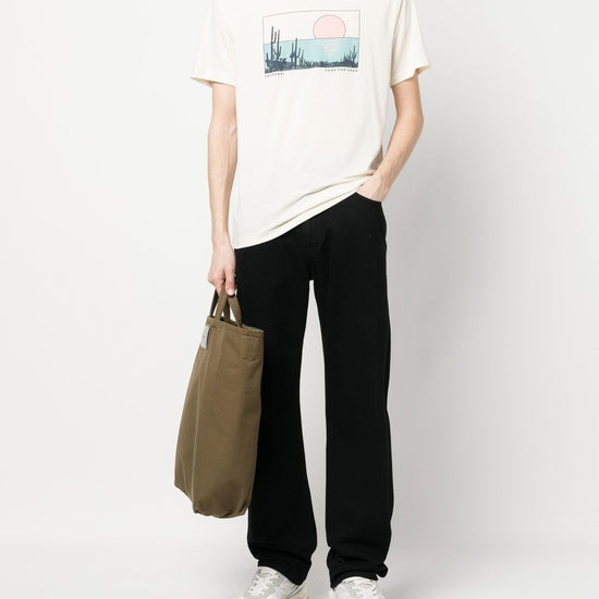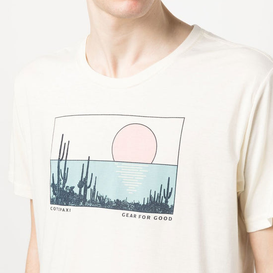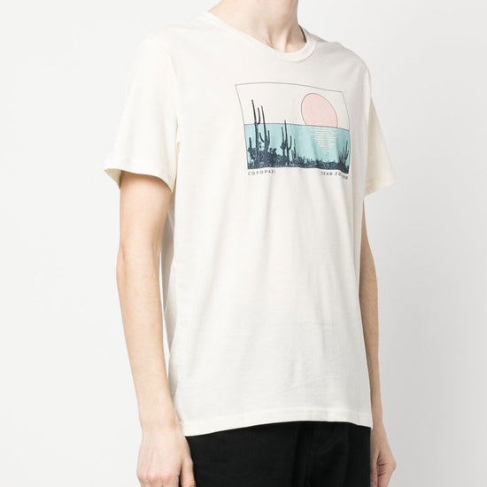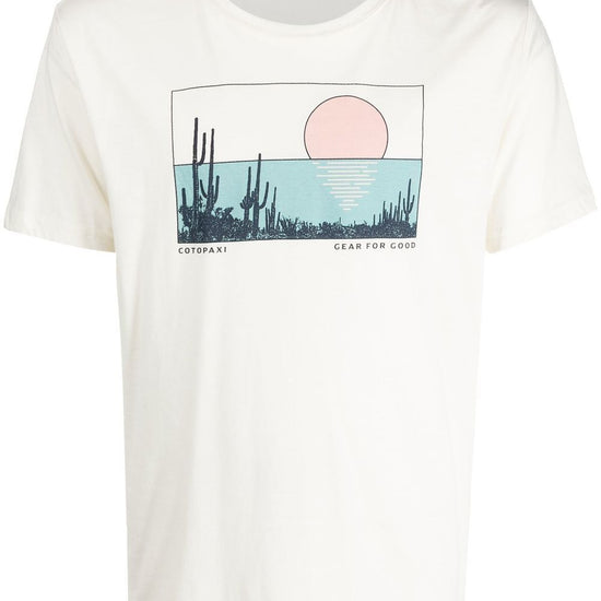 Graphic-print cotton t-shirt from cotopaxi featuring off-white, organic cotton-recycled polyester blend, graphic print to the front, round neck, short sleeves and straight hem. printed organic cotton t-shirt size and fit - this piece fits true to size. we recommend you get your regular size. model is 1,84m / 6ft 1in wearing size m