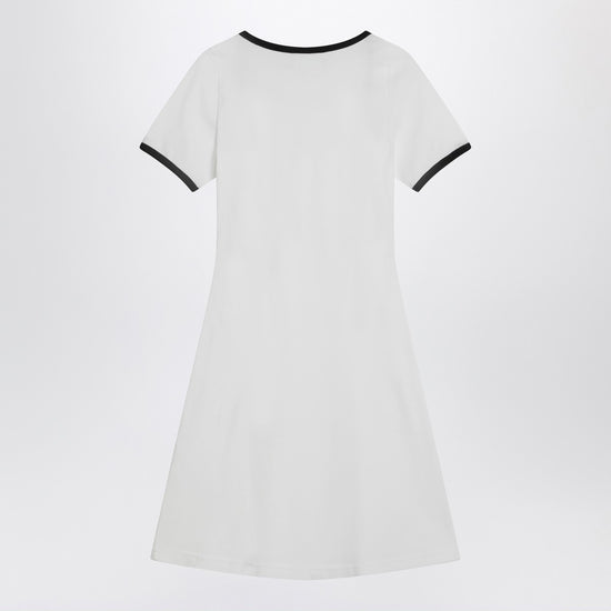 Mini dress by courrèges in white cotton, characterized by a wide round neck, short sleeves, contrasting black edges, and a small logo patch on the front. size and fit - model wears size s model measurements: height: 178 cm chest: 89 cm waist: 62 cm hips: 88 cm