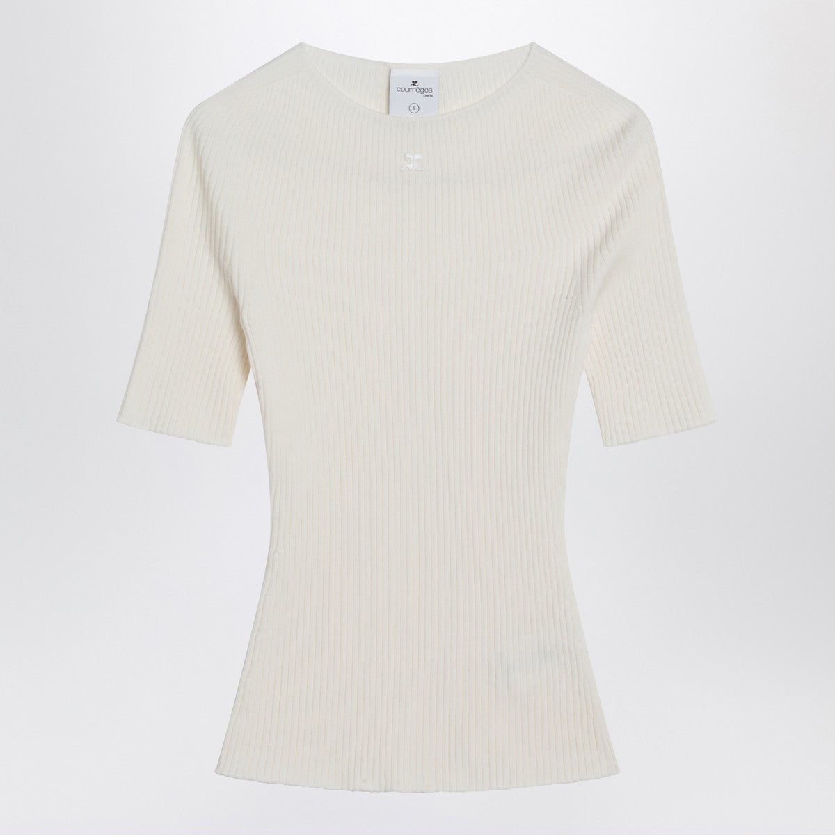 White cotton and wool crew neck sweater by courrèges, featuring short sleeves, ribbed design, and a small tone-on-tone logo patch on the front. size and fit - model wears size s model measurements: height: 178 cm chest: 89 cm waist: 62 cm hips: 88 cm