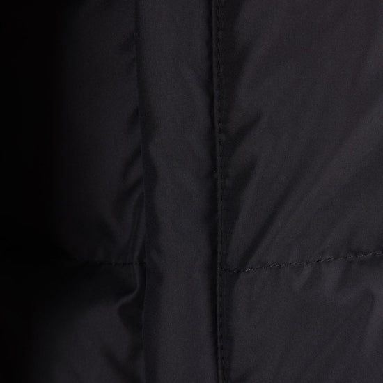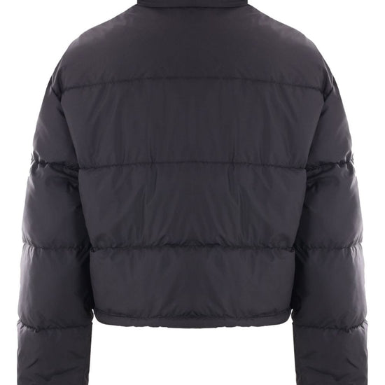Black padded design logo print to the front high neck front press-stud and zip fastening long sleeves two side slash pockets drawstring hem  nylon puffer jacket